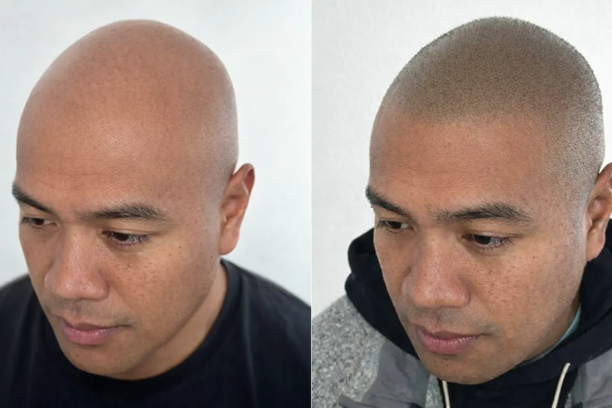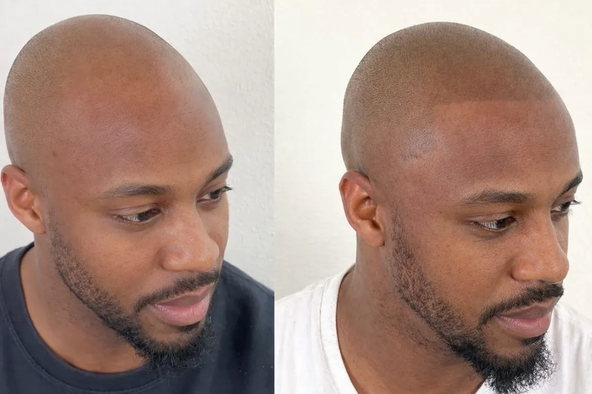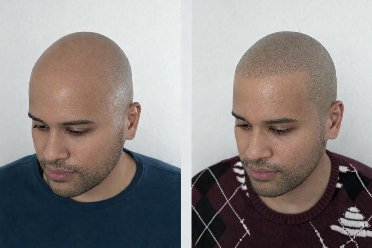 Simulación realista del antes y después, basada en tus propias fotos, para que visualices cómo lucirías con Micropigmentación Capilar antes de iniciar el tratamiento.